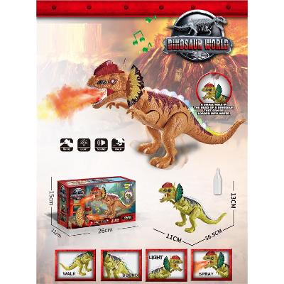 Dinozaur cu lumini si sunete. Pentru activarea functiei "flacari" puneti apa in rezervorul indicat deasupra capului dinozaurului si apasati butonul. Prezinta functie mers. Compozitie material: plastic.