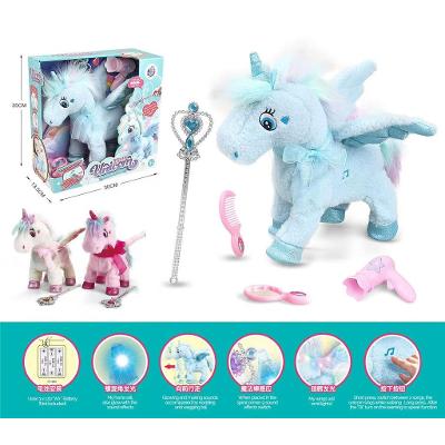 Unicorn cu multiple functii: 1) magie - pune bagheta in dreptul cornului si se vor auzi sunete magice insotite de lumini; 2) functie inregistrare - vorbeste cu unicornul si el va repeta dupa tine; 3) functie mers si cantec; 4) functie raspuns la atingere. Unicornul prezinta un program generos de melodii, sunete si lumini captivante pentru copii. Compozitie material: plastic, fibre poliester. A se curata cu o carpa umeda, moale. Nu cufandati produsul in apa.